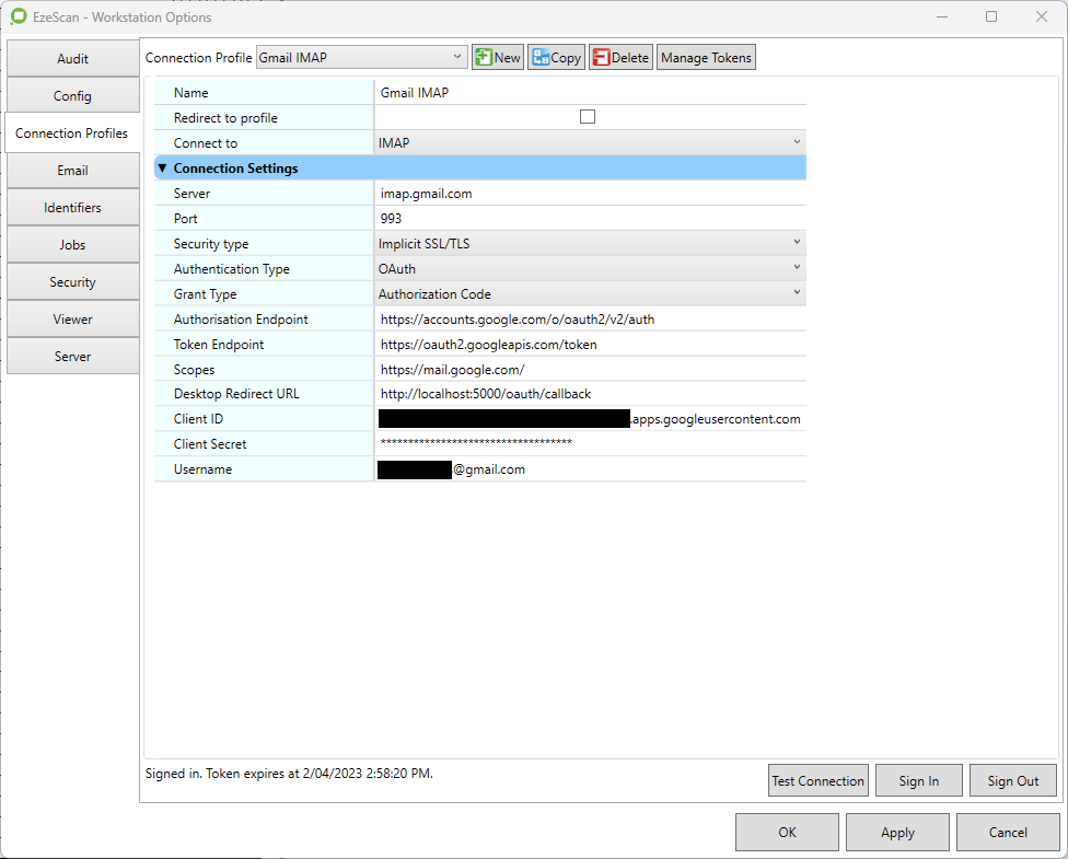 The following are the connection settings to configure in EzeScan > Workstation Options > Connection Profiles.