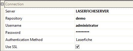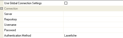 When configuring a Job, KFI or Upload to use the Laserfiche connector the connection settings panel must be filled in. If only using a single Repository, it is recommended that the Laserfiche connection settings are configured globally.