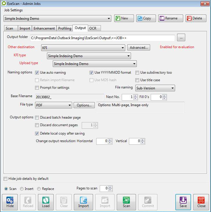 Using the KFI and UPLOAD modules. These are detailed further in sections Running a Job Using KFI and Upload and Upload Settings. This would be used for specific workflows that utilise EzeScan KFI to assist in minimal data entry, reusing data, forms extraction and setting workflow defaults.