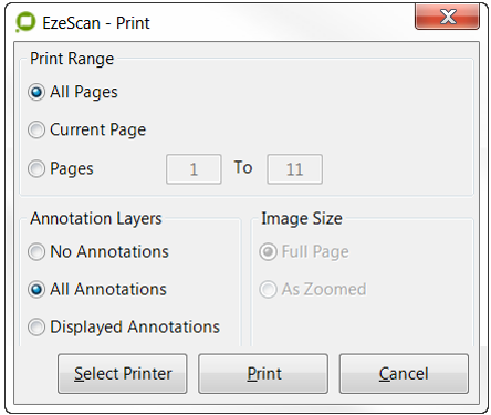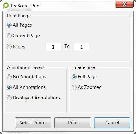 This option will display a print dialog screen; which is currently displayed image (opened using the File > Open option) in the viewer.