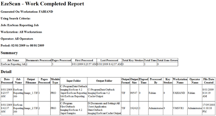 The sample report below shows the job that was used and also the job that the image has been routed to.