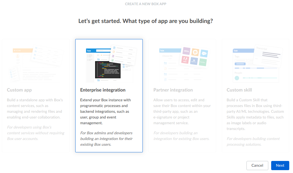 There will be a request for the type of app being built. Choose Enterprise integration, then click Next.