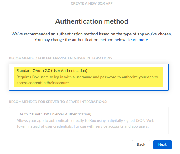 - A prompt will appear asking for the Authentication method to be defined. Select the Standard OAuth 2.0 (User Authentication) as this is what is required for the EzeScan BOX connector.