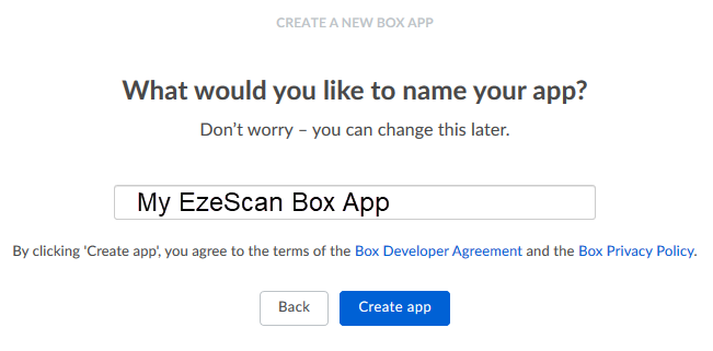 A pre-configured Inbuilt BOX connector registration has been created for the EzeScan Client / Server to simplify the authentication configuration process for the EzeScan Windows Client or Server application.