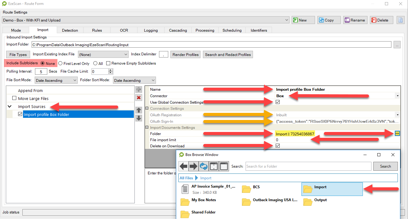 TIP: When importing from BOX (instead of a Windows file system) via “Import Folder Processing”, the Release function of the EzeScan client will not be able to release the downloaded document back to BOX and will instead release to the import folder specified in the EzeScan job. This is where it will be reloaded when “Import Folder Processing” is next called upon.