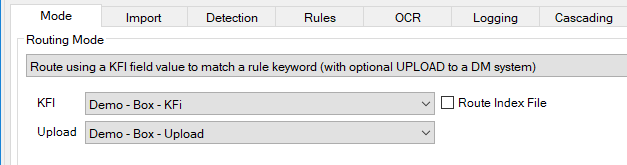 Where folder paths, document naming and/or metadata will be added, the Route mode should be configured as below and include a KFI and Upload to enable the inclusion of metadata.