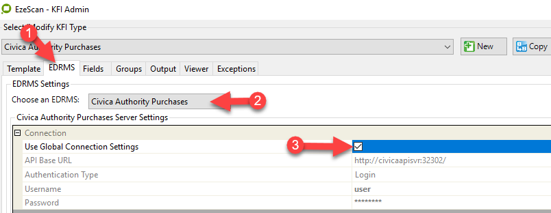 Tick the Use Global Connection Settings box or manually fill in the Connection settings Figure 3 - selecting the Civica Authority Purchases “Use Global Settings” on the KFI
