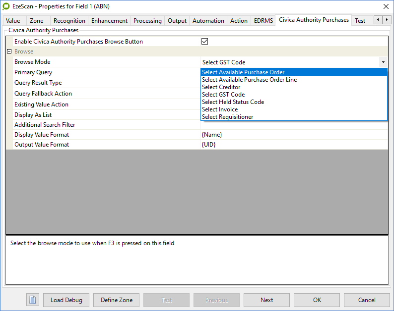 The following information details the connectivity and functionality offered by the EzeScan integration with the Civica Authority Financials solution. It details the available options and how to configure an EzeScan job to browse and save into Civica Authority Financials.