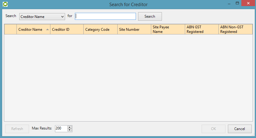 This will return the Creditor ID, Category Code, Site Number, Supplier Name, Bank BSB and Account details.If the ABN search fails then a search form can be used. The following screen will appear when selecting a search.