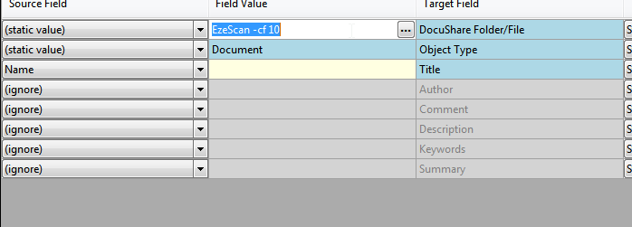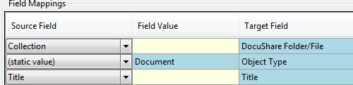 In the Field Mappings Grid the operator can apply the Source Field settings to the Target Field settings to populate the appropriate Target Field with the value picked up from the Corresponding KFI. In the example below the DocuShare Target Field Title is being populated by the KFI Source Field Title.