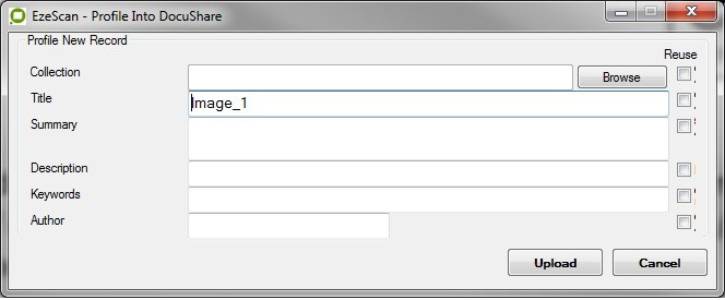 This field is the DocuShare Collection. The operator can set this to a static value which will display abrowse icon which will allow the operator to browse the DocuShare Collection structure and set a static Collection for the UPLOAD.