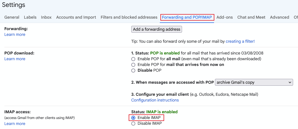 Check IMAP is enabled in Gmail