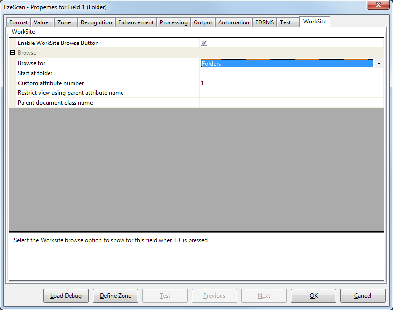 The WorkSite settings must be configured before a KFI field can use the WorkSite browse functionality.