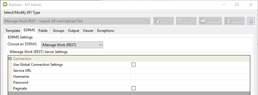 When configuring a Job, KFI or Upload to use the iManage Work connector the connection settings must be filled in.