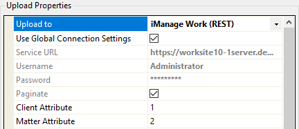 On the left hand side in the Upload Properties pane choose iManage Work (REST) in the Upload To list.