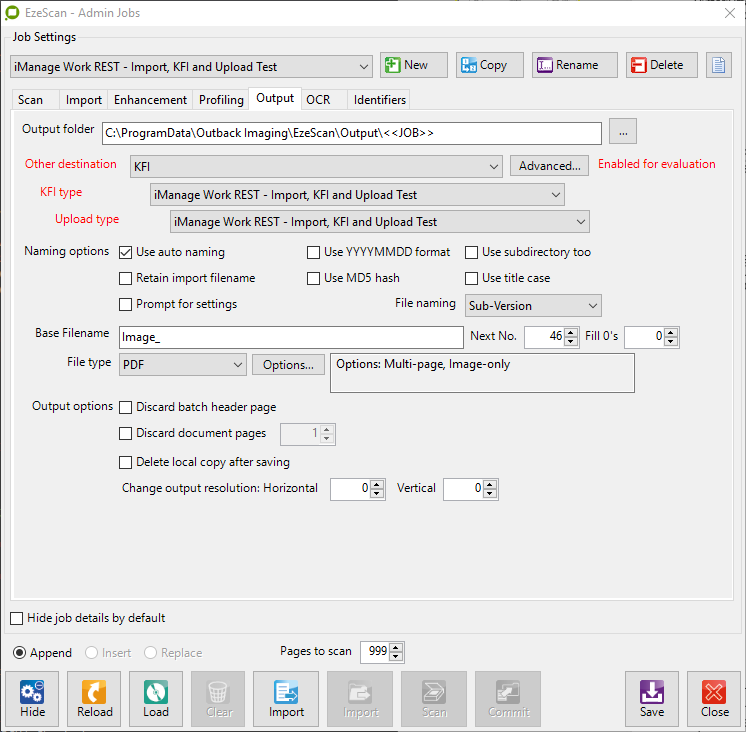 To enable iManage Work output functionality on an EzeScan Job, without using a KFI and Upload: