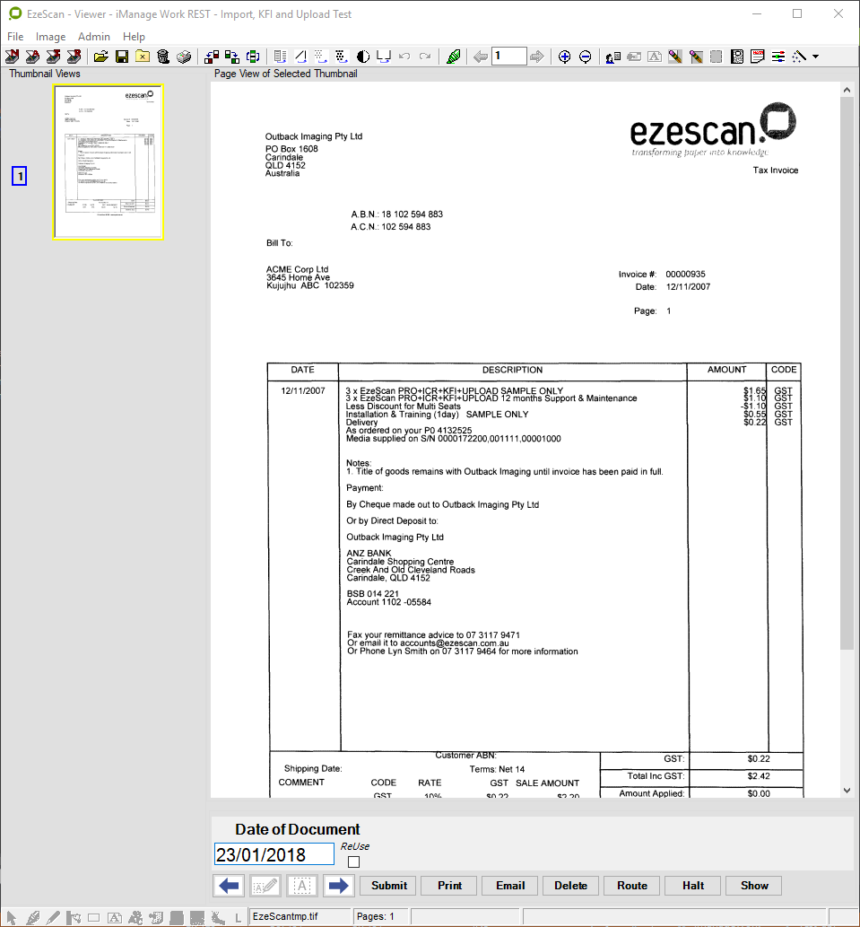 The EzeScan to iManage Work Profile Form functionality requires that the EzeScan Workstation be licensed with the EDRMS module.