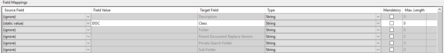 Class | Use this field to set the class field. E.g. doc, email, contract, scanned. This is a usually a mandatory field. If a class has been pre-set on the folder that the document is being uploaded to, EzeScan can inherit the value. To do this set the Class source field to a static value and set to “INHERIT_FROM_FOLDER”. |