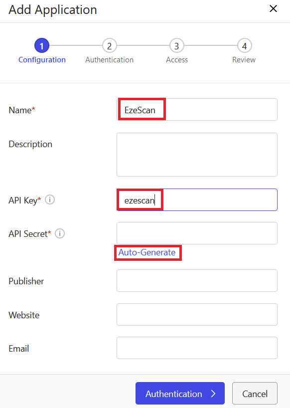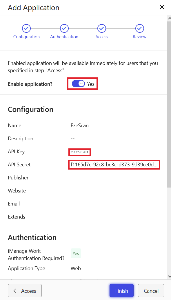 Store the API Key and Secret somewhere safe - these will be needed when configuring the connection in EzeScan.