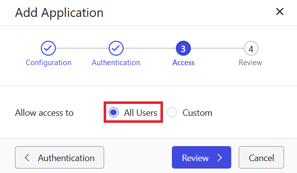 All Usersif any user should be allowed to sign-in using this integration, otherwise selectCustomand choose the desired users.Click