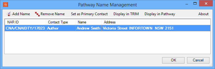 AutoLoc | Search for existing pathway names within Content Manager using the pathway key (e.g. CNA/CNAIDTY/17023). If no match is found a new location is automatically created within Content Manager with the pathway key as the ID Number and any other properties applied to it. All names passed into this field are added as contacts to the upload document. These contacts are what populates the items in the Pathway Name Management form as per the below screenshot. ![]() The Pathway ![]() This browse options returns the pathway keys as the display value, and the specially formatted value for use with Note that multiple names can be joined using the delimiter | IdNumber||CNA/CNAIDTY/17023||Surname||Smith||GivenNames||ANDREW ||Type||Person||DOB||||STREETADDRESS||Victoria Street INFORTOWN NSW 2151||MOBILE||0423154234561||EMAILADDRESS||||ContactType||Author |
