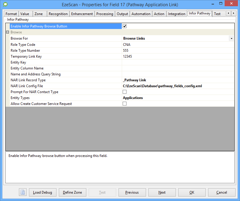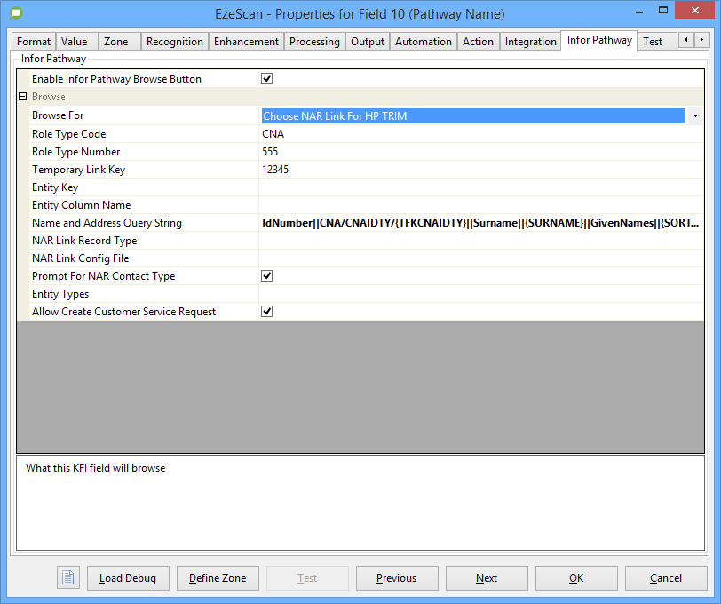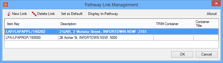 Create Related Records | Searches for existing pathway links within Content Manager using a pathway key (e.g. LPA/LPAPROP/12345). If no match is found a new link record is automatically created within Content Manager with both the pathway key and description populated. All links passed into this field are added as related records to the upload document. These related records are what populates the items in the Pathway Link Management form as per the below screenshot. ![]() The Pathway ![]() This browse options returns the specially formatted value for use with Note that multiple links can be joined using the delimiter | LPA/LPAPROP/140202||_Pathway Link||||Pathway Primary Key::LPA/LPAPROP/140202||Pathway Container::||Pathway Description::2-GAR, 2 Victoria Street, INFORTOWN NSW 2151##LPA/LPAPROP/169580||_Pathway Link||||Pathway Primary Key::LPA/LPAPROP/169580||Pathway Container::||Pathway Description::2B Archer St, INFORTOWN NSW 5000 |