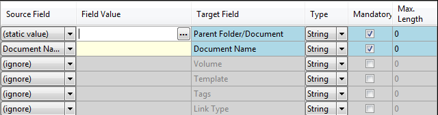 Each field can have its input set using the Source Field cell, noting that the Parent Folder/Document can’t be set to ignore.