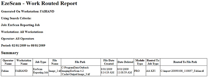 The sample report below shows the job that was used and also the job that the image has been routed to.