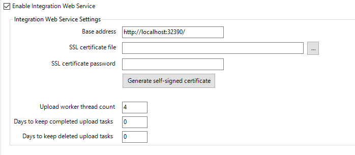 It is recommended to use a certificate (if possible). The customer can supply their own in as a .pfx (with password) or can selft generate. Note: the certificate will also need to be installed on any machines connecting to this service (e.g. WebApps server). For a production environment it is recommended to set settings to keep deleted and upload tasks to be 0.