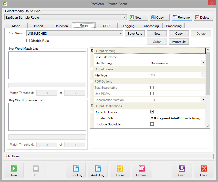 From the Routing Admin form press the Run Routing button to run the selected Routing job. The EzeScan ROUTING module will poll the import locations (directory, sub-directory, POP3 mailbox, FTP server) looking for incoming images to process.As each incoming document is processed, the first page of the document is displayed on the document viewer panel, and the resulting OCR text is display in the text box panel. The name of the rule matched for the document is also displayed.As each incoming document is routed, the "Routed" counter is incremented by 1 to keep track of how many documents have been routed in this processing session. This provides the operator with a quick method of determining how many files have been processed by the ROUTING module. When an image matches a rule defined by the operator the image will be routed to that rules output destination. E.g. directory, email or FTP, in the specified format. I.e. TIF, image only PDF, text searchable PDF).