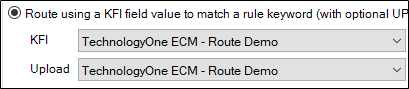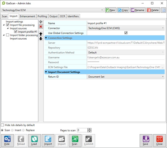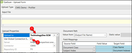 When configuring a Job, KFI or Upload to use the TechnologyOne ECM connector the connection settings panel must be filled in. There are two ways this can be achieved: