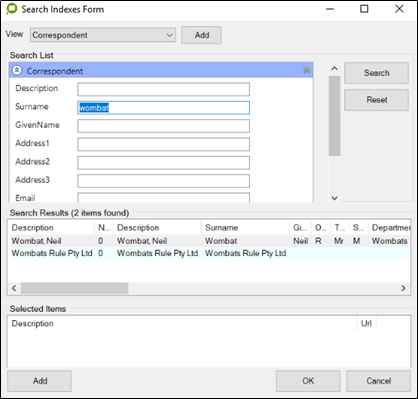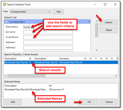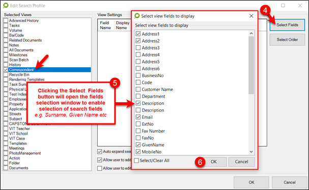 Click OK once the required fields have been selectedFigure 9 - selecting the fields to be used in the Correspondent search screen