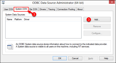 Navigate to the ‘System DSN’ tab and click “Add”.Figure 13 - select System DSN tab & click on Add button