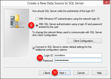 Populate the boxes with the appropriate Username & Password and click the NextFigure 16 - set the SQL authentication