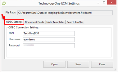 An ODBC (read only) connection is required to pull back the document schema from the TechnologyOne ECM Server.