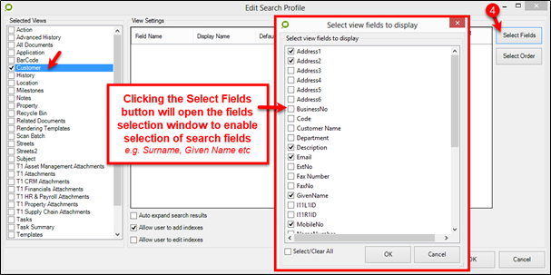 Click the Edit button and the screen below will appear. Find the index name you require e.g. Correspondent and click the Select Fields