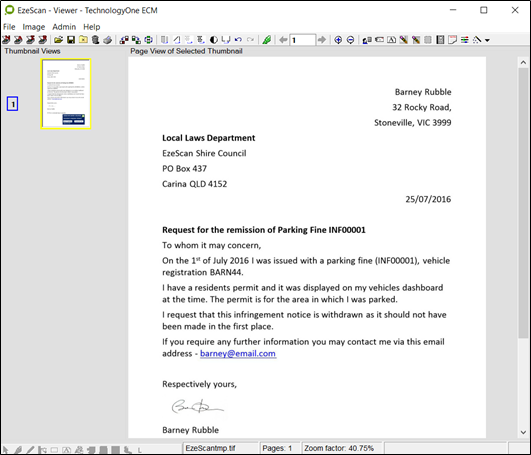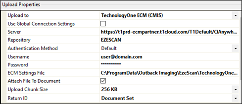 The following information details the connectivity and functionality offered by the EzeScan integration with the TechnologyOne ECM solution. It details the available options and how to configure an EzeScan job into TechnologyOne ECM.