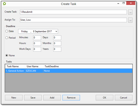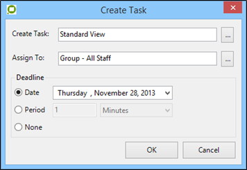 Create Task will allow the operator to select the Type of task as well as specific users it can be executed for within a certain period, deadline or no time limit.