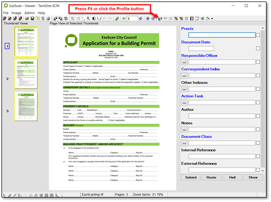 Press F4 or click the Profile button to begin indexing the document. The profiling fields will appear (in this example they are set in List mode to the right of the image)Figure 72 - Press F4 or click the Profile button to begin indexing