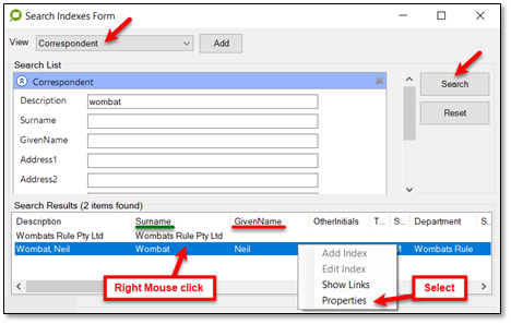 Select the Properties optionFigure 80 - Search Index - find a name, right mouse click & select Properties