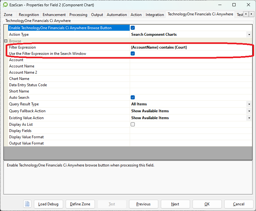 In the image below, the red area shows settings related to the Filter Expression which is used perform searches beyond what is provided in the search field settings.