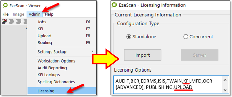 Figure 1 - Select Admin > Licensing then check that Upload & KFI appear in the Licensing Options window