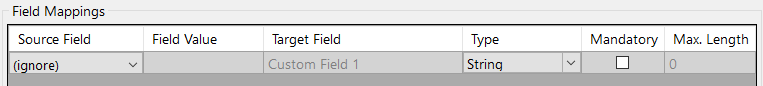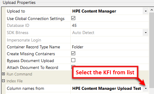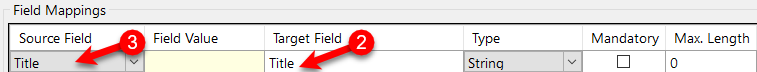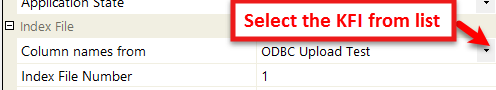 Column Names From | Default is (none) Firstly the operator will need to select the KFI that will be used. ![]() Figure 11 - select the appropriate KFI from the list Then in the Source field a drop down list will appear showing the KFI fields. The operator can select the respective KFI field to map to the Upload field. In this case it is "Title" ![]() Figure 12 - matching the KFI (source) field to the connector’s (target) field |