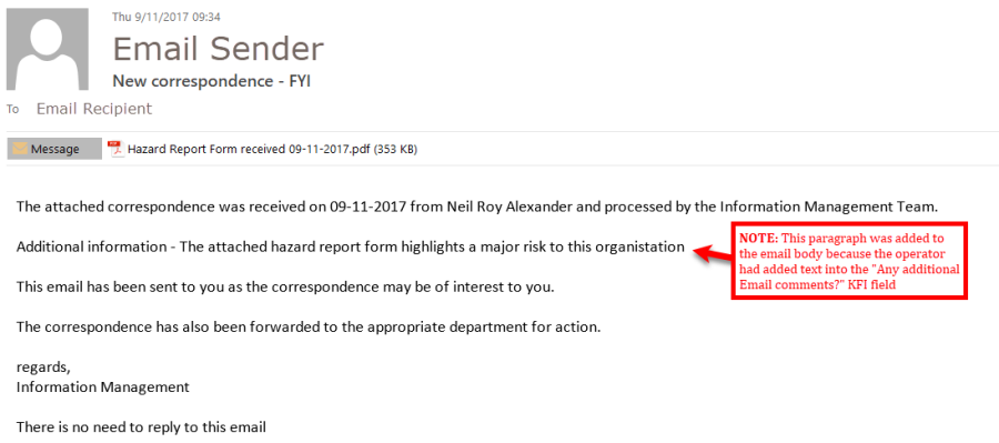 The attached correspondence was received on <<IF9>> from <<IF11>> and processed by the Information Management Team.<<IF17>><<br>><<br>>This email has been sent to you as the correspondence may be of interest to you.<<br>><<br>>The correspondence has also been forwarded to the appropriate department for action.<<br>><<br>>regards,<<br>>Information Management<<br>><<br>>There is no need to reply to this email