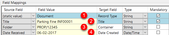 Index File Type | CSV (default) The advantage of using this method is if KFI fields are moved then no remapping needs to be done. Static values can also be set but the node needs to be identified as <<IXN{{field_name}}>> The operator can also do a calculation on a numeric value. E.g. <<=IXX{{ezescan_kfi_indexes/file/Amount}} + 1>> |