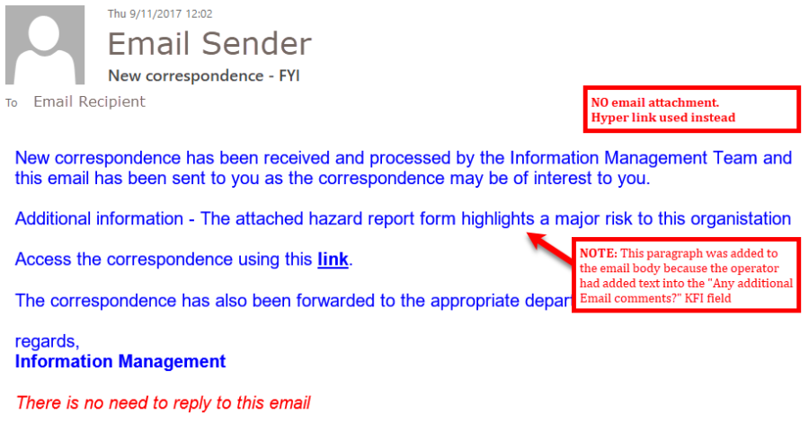 <body><span style="font-family:Arial"><span style="color:#0000ff"><p>New correspondence has been received and processed by the Information Management Team and this email has been sent to you as the correspondence may be of interest to you.</p><<IF17>><p>Access the correspondence using this <a href="<<S1>>"><strong>link</strong></a>.</p><p>The correspondence has also been forwarded to the appropriate department for action.</p><p>regards,<br><strong>Information Management</strong></p><p><i><span style="color:#ff0000">There is no need to reply to this email</i></span></p></span></span></body>The hyperlink shown in this example is using the file name & filepath <<S1>> of the processed document. This will naturally change if using a hyperlink to a document saved to an EDRMS (if the EDRMS has this functionality.