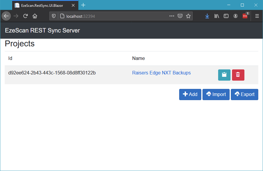 Projects are managed via EzeScan REST Sync's web page (http://localhost:32394).