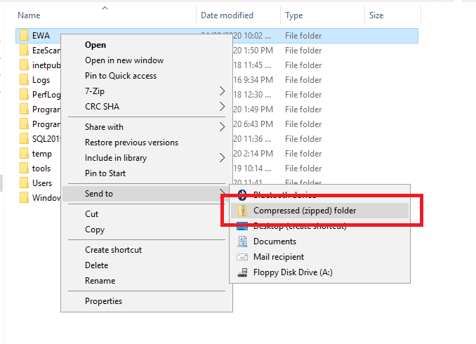 - Browse to the EzeScan WebApps installation path and then right click > Send to > Compressed (zipped) folder.