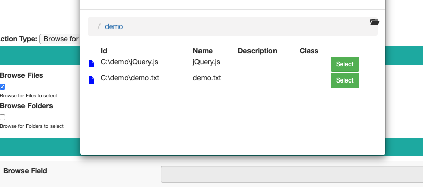 Browsing allows a record, document or container to be selected using the integrations native structure. This usually follows in the style of a folder structure familiar to most, but may vary based on the integration. It allows selection, navigation, and displaying of properties at the discretion of both configuration, and users.