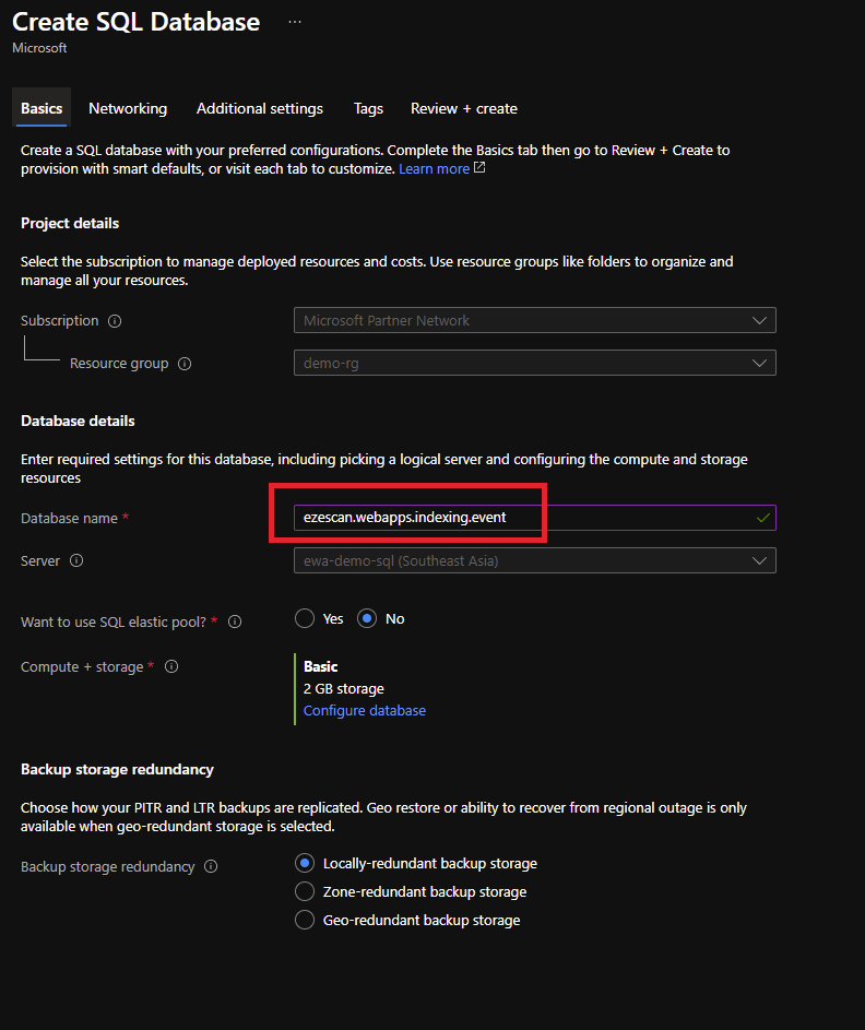 "connectionString": "Server=tcp:ewa-demo-sql.database.windows.net,1433;Initial Catalog=ezescan.webapps.indexing.event;Persist Security Info=False;User ID=ewa-dba;Password={your_password};MultipleActiveResultSets=False;Encrypt=True;TrustServerCertificate=False;Connection Timeout=30;"